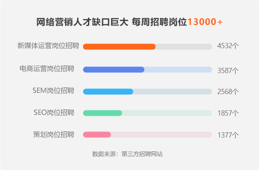 隨著5G等相關(guān)科技、互聯(lián)網(wǎng)新技術(shù)的快速發(fā)展及應(yīng)用,更多的企業(yè)感受到網(wǎng)絡(luò)營銷的魅力,意識到自身進行數(shù)字化轉(zhuǎn)型的必要性,企業(yè)對互聯(lián)網(wǎng)營銷人才的需求量也越來越大。據(jù)相關(guān)數(shù)據(jù)統(tǒng)計,網(wǎng)絡(luò)營銷市場需求熱度居高不下,每周新增崗位約13000+,才供不應(yīng)求。