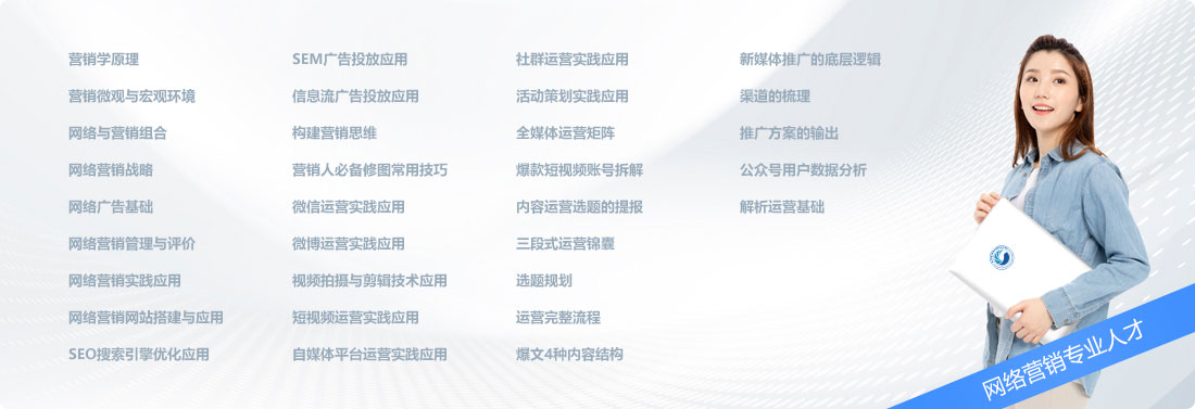 網(wǎng)絡(luò)營銷專業(yè)是以現(xiàn)代營銷理論為基礎(chǔ),借助網(wǎng)絡(luò)、通信和數(shù)字媒體技術(shù)實現(xiàn)營銷目標(biāo),為企業(yè)在各大互聯(lián)網(wǎng)平臺打造運營體系,擴大知名度、提升品牌曝光、實現(xiàn)產(chǎn)品轉(zhuǎn)化。通常是指利用抖音、快手、微信、微博、短視頻、社群等新興媒體平臺工具,進行產(chǎn)品宣傳、推廣、營銷的一系列運營手段。本專業(yè)培養(yǎng)獨創(chuàng)精神和較強實踐能力,掌握信息技術(shù)、電子商務(wù)、消費心理等基礎(chǔ)知識和網(wǎng)絡(luò)營銷策劃相關(guān)知識,具備網(wǎng)絡(luò)促銷策劃與實施、文案撰寫與發(fā)布、網(wǎng)絡(luò)客戶關(guān)系管理、數(shù)據(jù)分析應(yīng)用等能力的高素質(zhì)技術(shù)技能人才。具體研究方向如下:網(wǎng)絡(luò)推廣、網(wǎng)絡(luò)營銷、廣告投放、自媒體運營、內(nèi)容運營、搜索引擎優(yōu)化、活動策劃、文案策劃等。